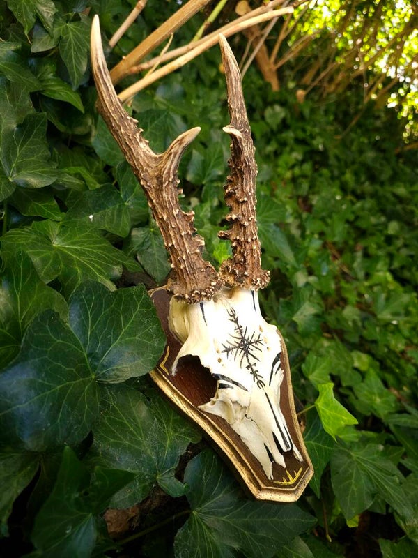 Materiaal / materials: antique hertenschedel, hout, verf / antique deer skull, wood, paint